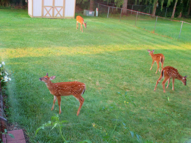 I had the triplets show up last week. They are beautiful with their spots and fun to watch. They showed up alone for at least 15 minutes alone.